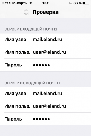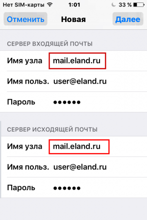 Для примера покажем настройки аккаунта для почтового ящика user@eland.ru с паролем 123456.