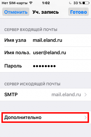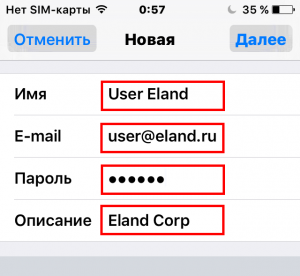Для примера покажем настройки аккаунта для почтового ящика user@eland.ru с паролем 123456.